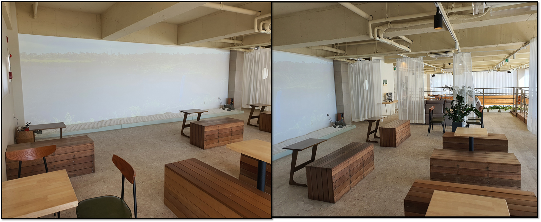▶2층에는 좀 특이한 소품(?)이 있는데 벽 한쪽에 대형 스크린이 있고 바다를 연상시키려는 의도인지 백사장 모래와 돌들이 조그맣게 놓여 있었다. 나는 낮에 가서 이 스크린 벽면이 주는 매력을 온전히 느끼지 못했지만, 해가 지는 무렵에 가면 인공(?) 오션뷰가 될 것 같고 화면이 워낙 크다 보니 꽤 괜찮을 것 같다는 생각이 들었다.