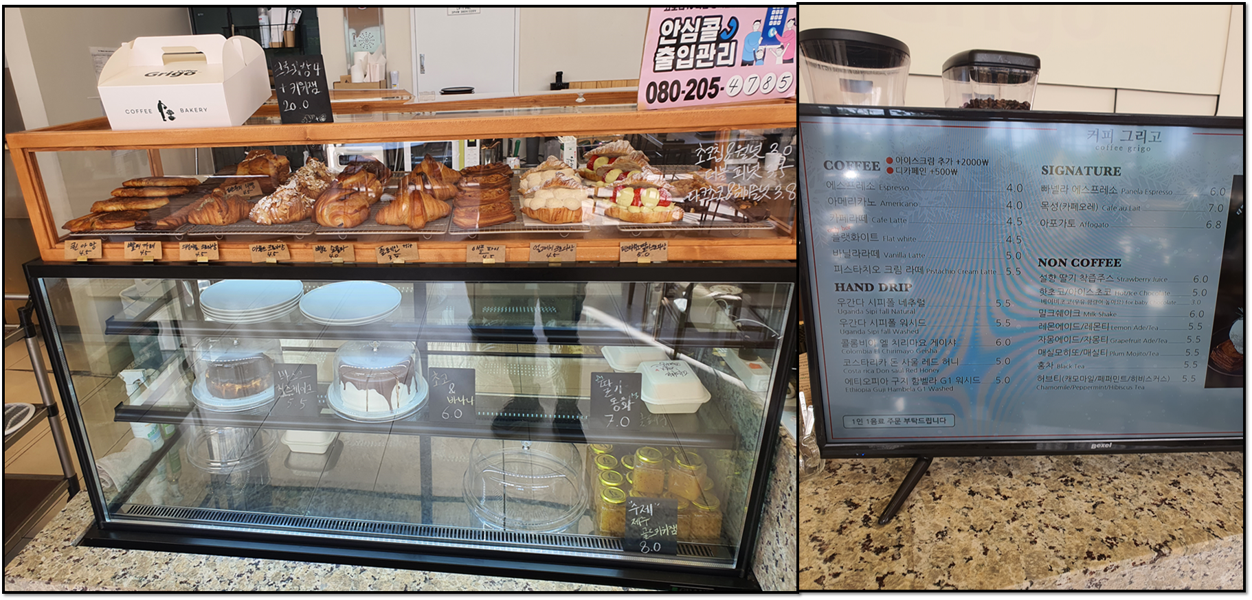 ▶메뉴 소개 가게에서 만든 빵이 진열되어 있고, 커피와 기타 음료 종류도 많아 선택지가 꽤 많다.(그럼에도 나는 늘 카페라테다.)